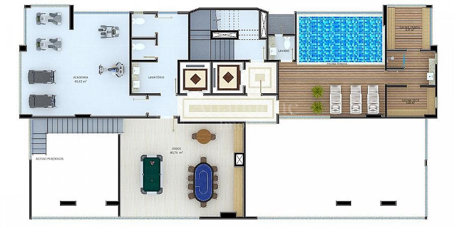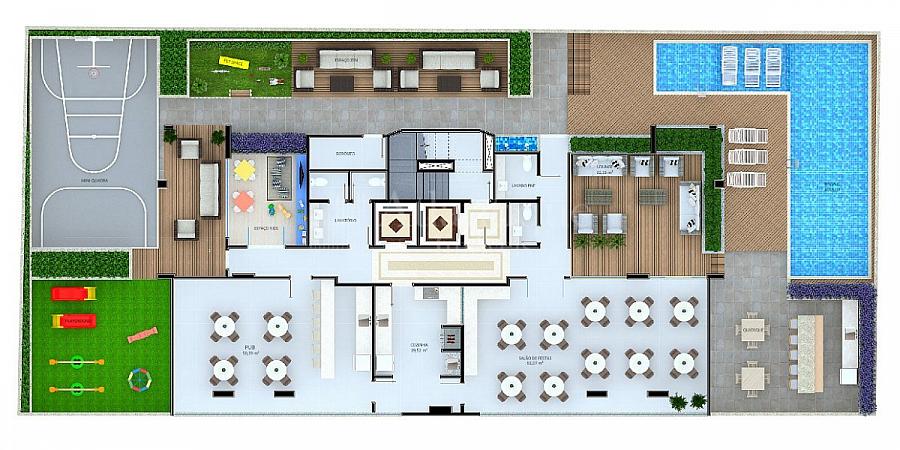 - Possui área de lazer completa, distribuída em dois andares e com 15 ambientes ao todo. O destaque vai para o salão de festas: com pé direito duplo, é interligado ao pub, à sala de jogos e possui um lounge anexado.